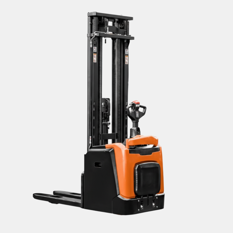 Empilhadeira patolada elétrica de 1600 kg com elevação máxima de 5500 mm e bateria em lítio.