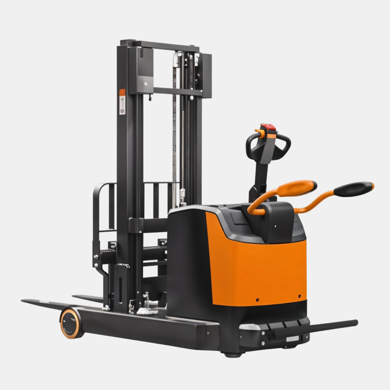 Empilhadeira patolada retrátil elétrica de 1600 kg, elevação até 5500 mm e largura total de 1074 mm.